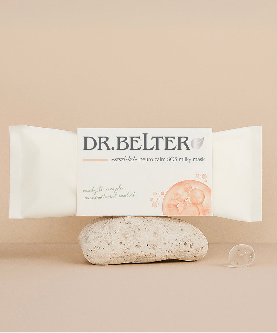 Puristische Tuchmaske aus Bio-Baumwolle getränkt in einer stark beruhigenden und pflegenden D-Stress Wirkstoffemulsion. Optimal zur Linderung bei akuten Reiz- und Stresszuständen der Haut. Entspannen und tief durchatmen nicht vergessen!